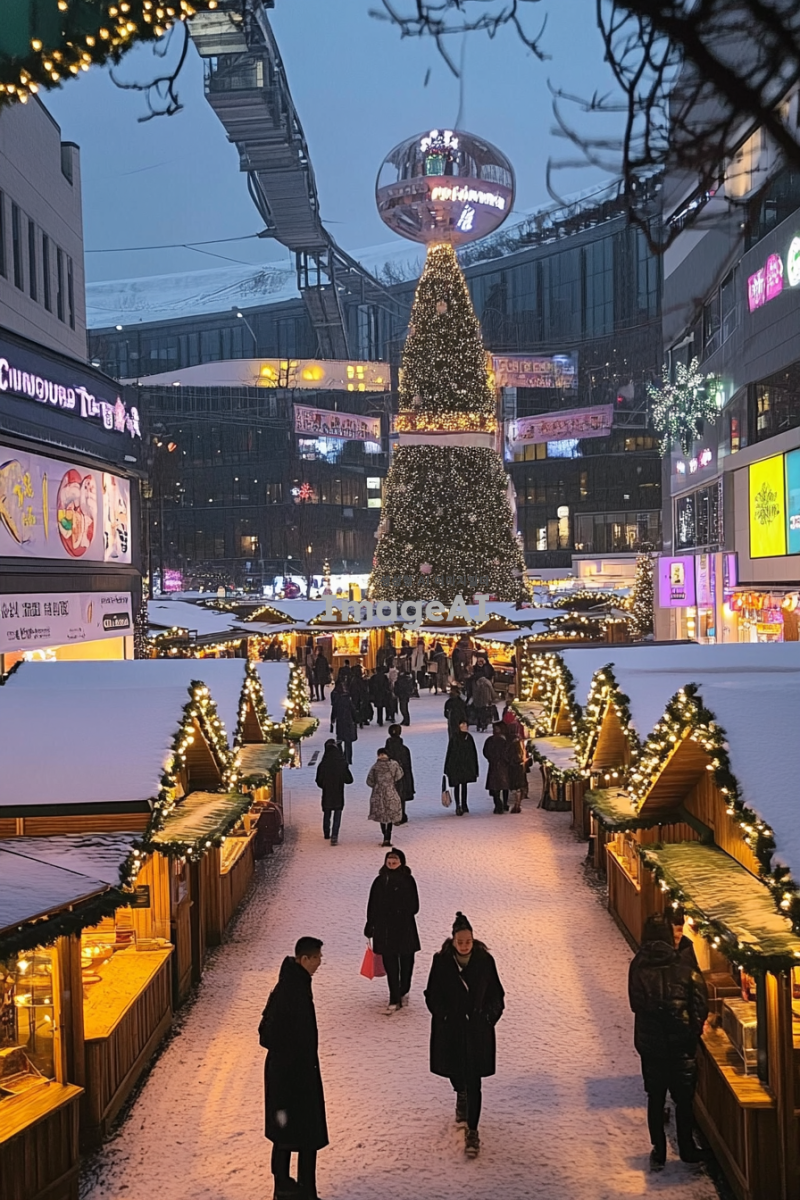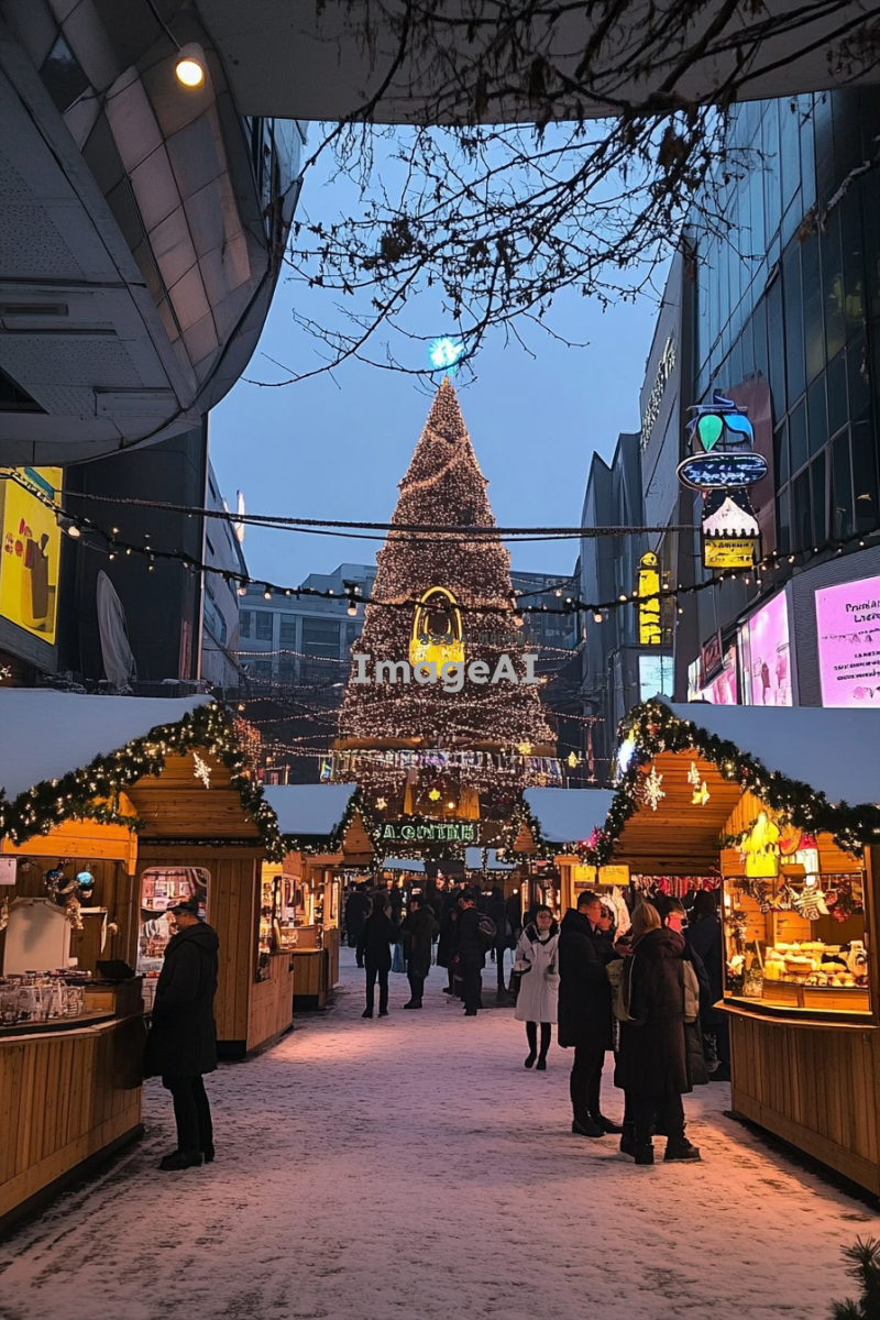 눈 내리는 겨울 풍경 속에 활기찬 크리스마스 마켓, 다양한 크리스마스 조명과 장식들로 가득한 거리, 따뜻한 음료와 간식을 제공하는 작은 나무 오두막들, 사람들이 즐거운 표정으로 쇼핑하고 있는 모습, 전통적인 유럽 스타일의 크리스마스 장식과 함께 반짝이는 트리, 가족과 친구들이 함께 즐길 수 있는 놀이기구와 공연, 따뜻한 분위기의 크리스마스 음악이 흐르는 배경, 런던과 파리의 크리스마스 마켓 특유의 분위기를 반영한 다양한 문화적 요소들.