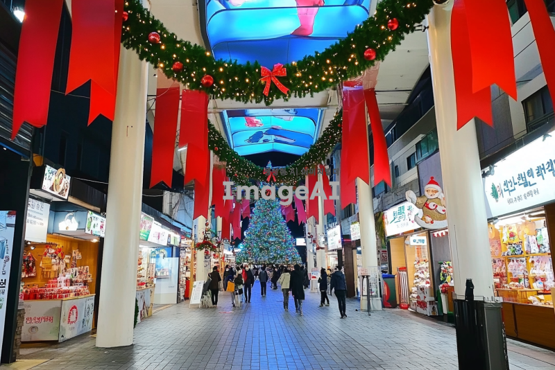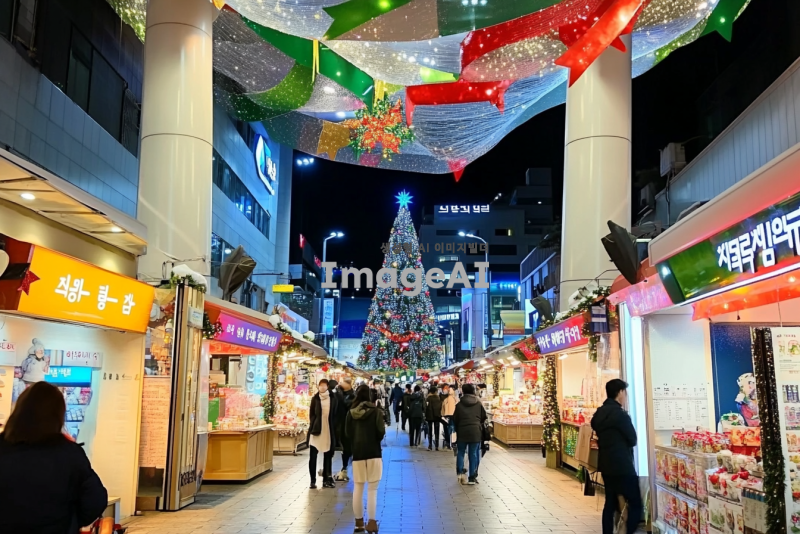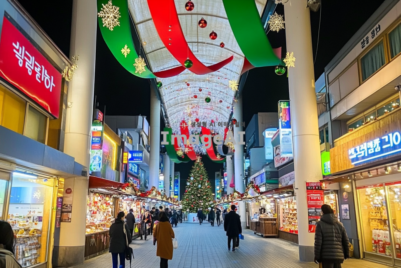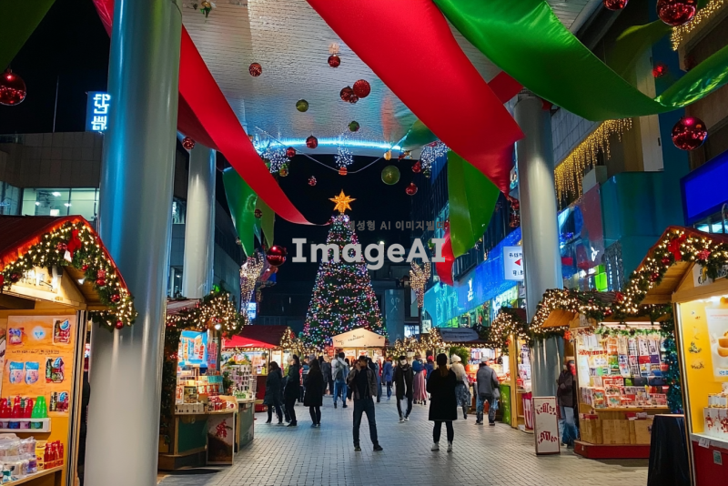 청주 스카이로드에서 크리스마스 마켓이 열리는 장면, 스카이로드 천장에 반짝이는 크리스마스 장식 이미지가 매달려 있고, 기둥에는 빨간색과 녹색 리본 및 장식이 감겨 있는 모습, 다양한 크리스마스 마켓 부스에서 따뜻한 음료와 선물들이 판매되고 있으며, 중앙에 화려한 크리스마스 트리가 장식되어 있는 장면, 사람들이 겨울 옷을 입고 마켓을 즐기고 있는 활기찬 분위기.