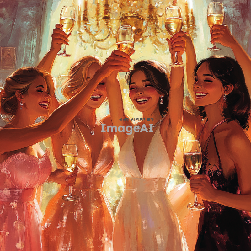 화려한 드레스를 입은 미소녀들이 우아한 파티에서 와인잔을 들고 웃으며 건배하는 장면, 배경은 럭셔리한 실내 공간, 조명은 부드럽고 따뜻한 분위기, 각 인물은 다양한 드레스 색상과 스타일로 개성을 표현, 미소녀들의 생동감 넘치는 표정과 함께 즐거운 분위기 강조.