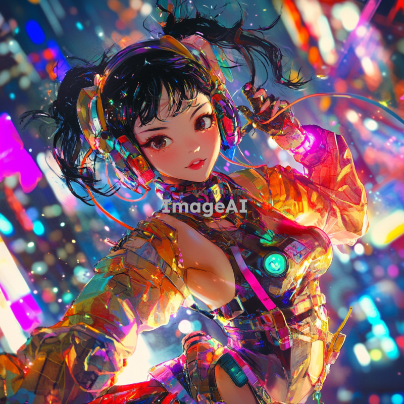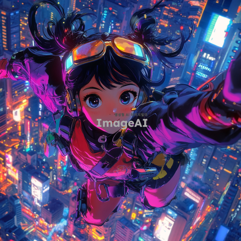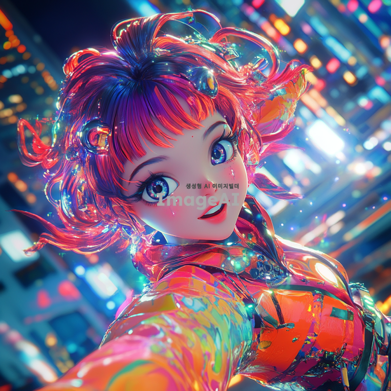 히메컷을 한 지뢰계 스타일의 여자 캐릭터, 애니메이션 스타일, 큰 눈과 생동감 있는 표정, 화려하고 독특한 의상, 배경은 도시의 야경, 밝고 화사한 색감, 일본 애니메이션 특유의 디테일과 스타일, 캐릭터의 자세는 역동적이고 활기찬 느낌, 머리카락은 바람에 흩날리는 듯한 효과, 캐릭터 주위에 반짝이는 빛 효과 추가.