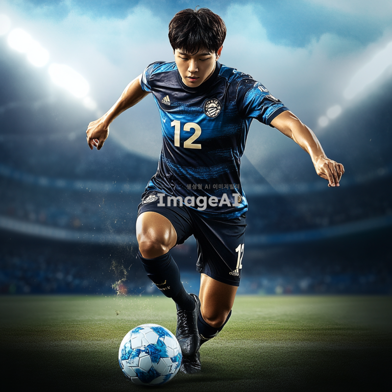 인천유나이티드 유니폼을 입고 축구공을 향해 슈팅 자세를 취하고 있는 남자 선수, 등번호 12번이 선명하게 보이고, 이름은 전도원이 유니폼 뒷면에 적혀 있음, 경기장 배경, 역동적인 포즈, 자연스러운 조명과 그림자, 현실적인 인물 묘사.