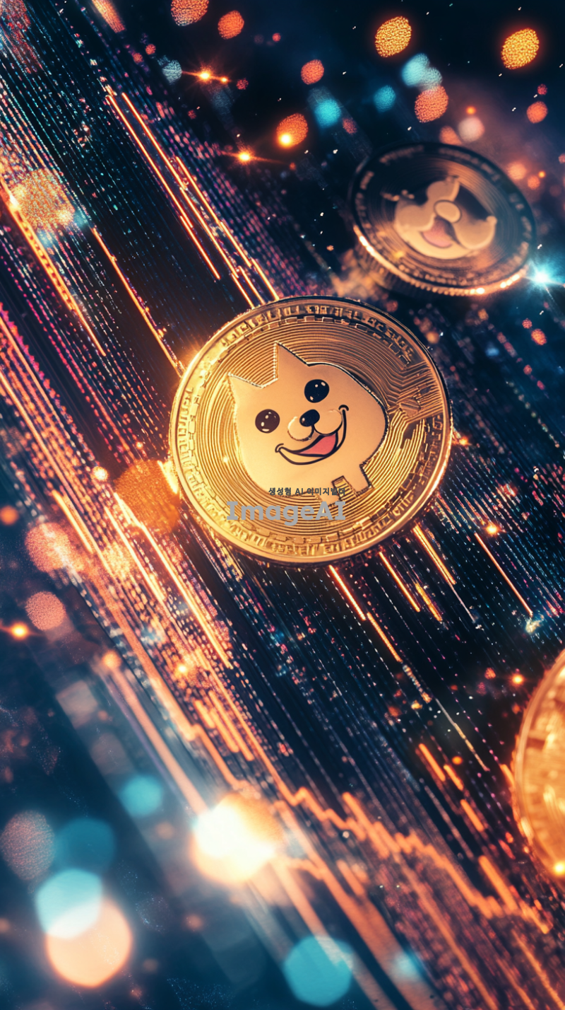 비트코인의 상승과 함께 도지코인과 시바이누 코인의 가치가 상승하는 모습을 표현한 이미지, 암호화폐 그래프와 함께 도지코인과 시바이누 코인의 로고가 강조된 장면, 디지털 화폐의 미래를 상징하는 현대적이고 세련된 분위기, 다양한 색상의 빛과 반짝임이 있는 배경, 기술적이고 혁신적인 느낌을 주는 요소들 포함.