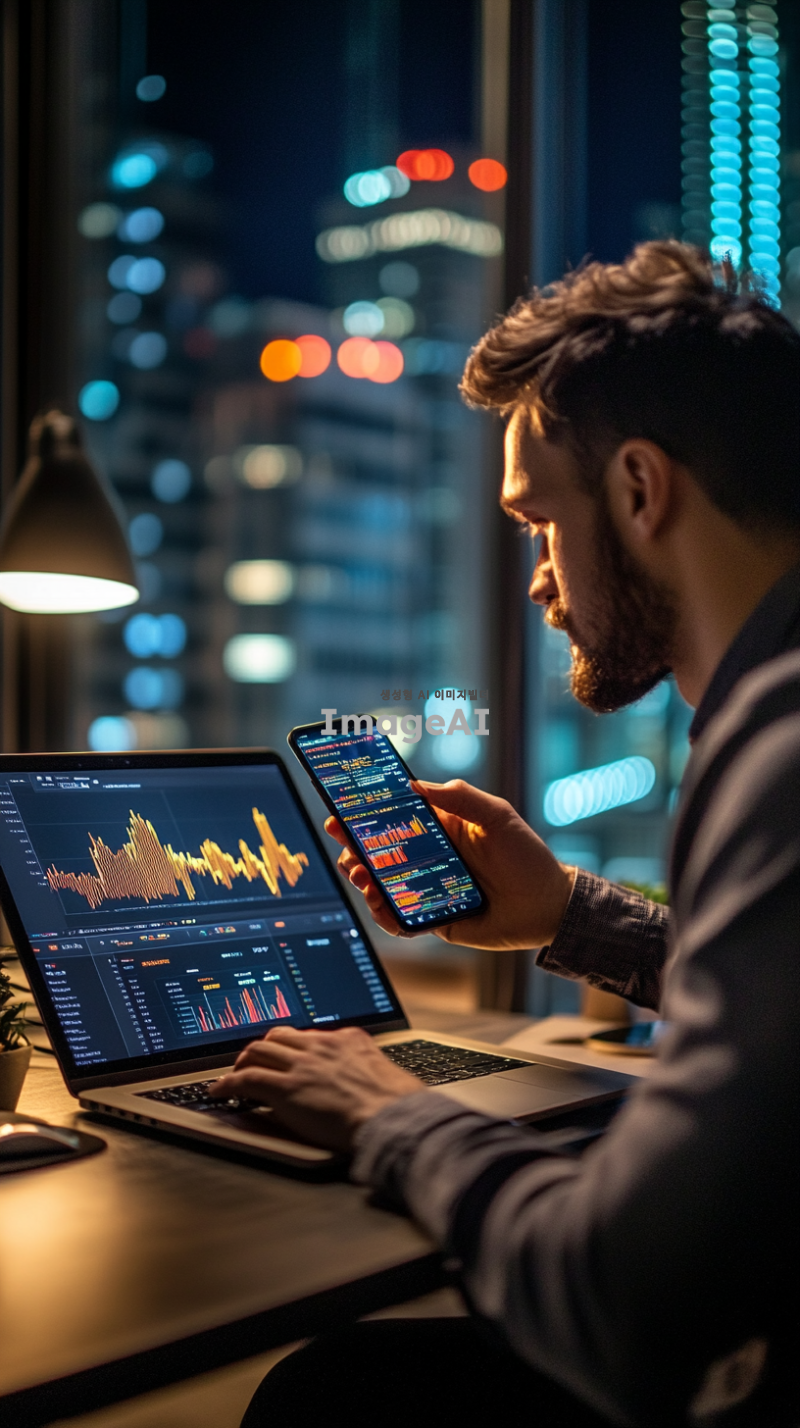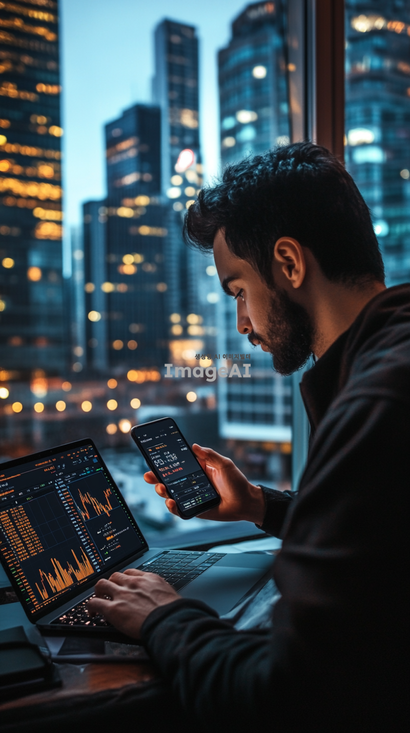 현대적이고 세련된 사무실에서 노트북 화면에 코인 가격 차트를 보며 집중하는 남성, 그의 손에는 스마트폰이 들려있고, 화면에는 암호화폐 거래 애플리케이션이 열려 있음. 주변에는 최신 기술 장비와 깔끔한 인테리어가 배치되어 있으며, 창밖으로는 도시의 스카이라인이 보임. 조명은 자연광과 인공 조명이 조화를 이루며 밝고 활기찬 분위기를 연출.