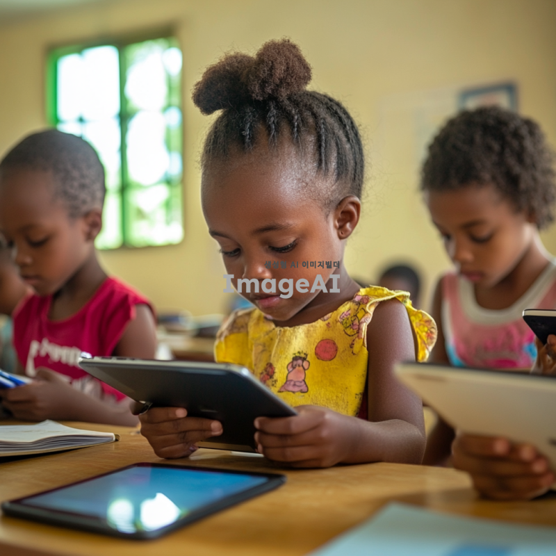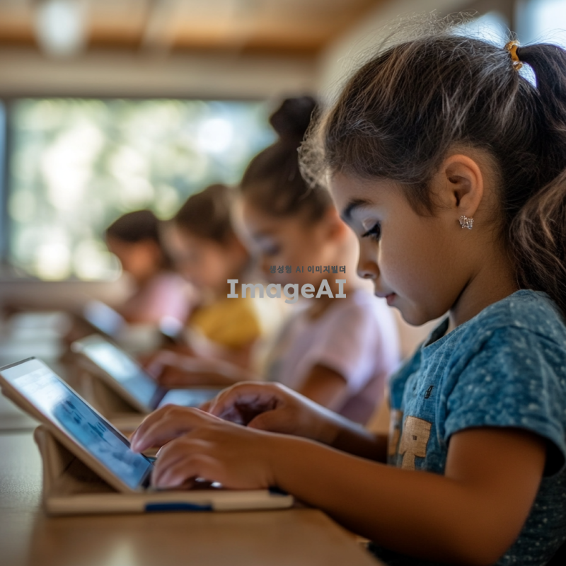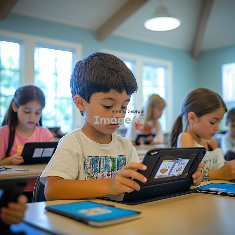 밝고 현대적인 학원 교실에서 여러 명의 아이들이 각자 태블릿 PC를 사용하며 공부하고 있는 장면. 아이들은 다양한 인종과 성별로 구성되어 있으며, 집중하고 있는 모습. 교실은 깔끔하고 정돈되어 있으며, 창문을 통해 자연광이 들어오는 따뜻한 분위기. 최신 기술을 활용한 학습 환경을 강조하여, 책상 위에는 태블릿과 함께 필기 도구와 노트가 놓여 있음. 아이들은 서로 소통하거나 개별적으로 학습에 몰두하는 모습으로, 교육의 미래를 보여주는 장면.