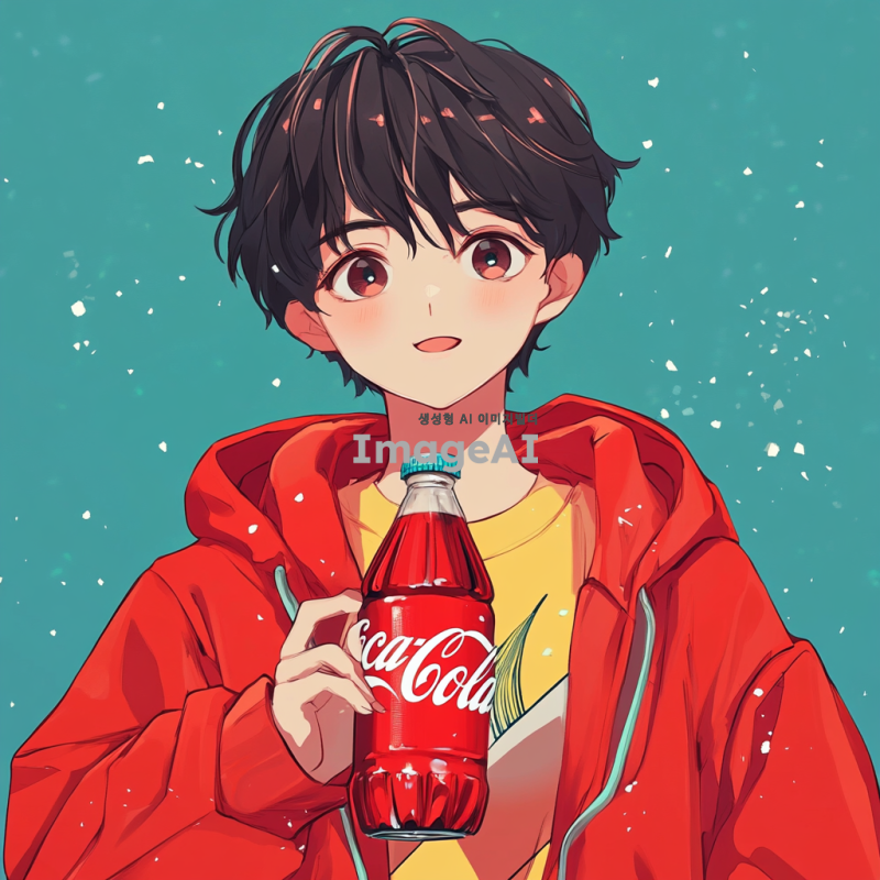 웹툰 스타일의 귀여운 남자아이, 코카콜라를 들고 있는 장면, 밝고 활기찬 분위기, 큰 눈과 미소를 가진 캐릭터, 생동감 있는 컬러 팔레트, 현대적인 의상과 배경, 청량감을 주는 요소들 포함.