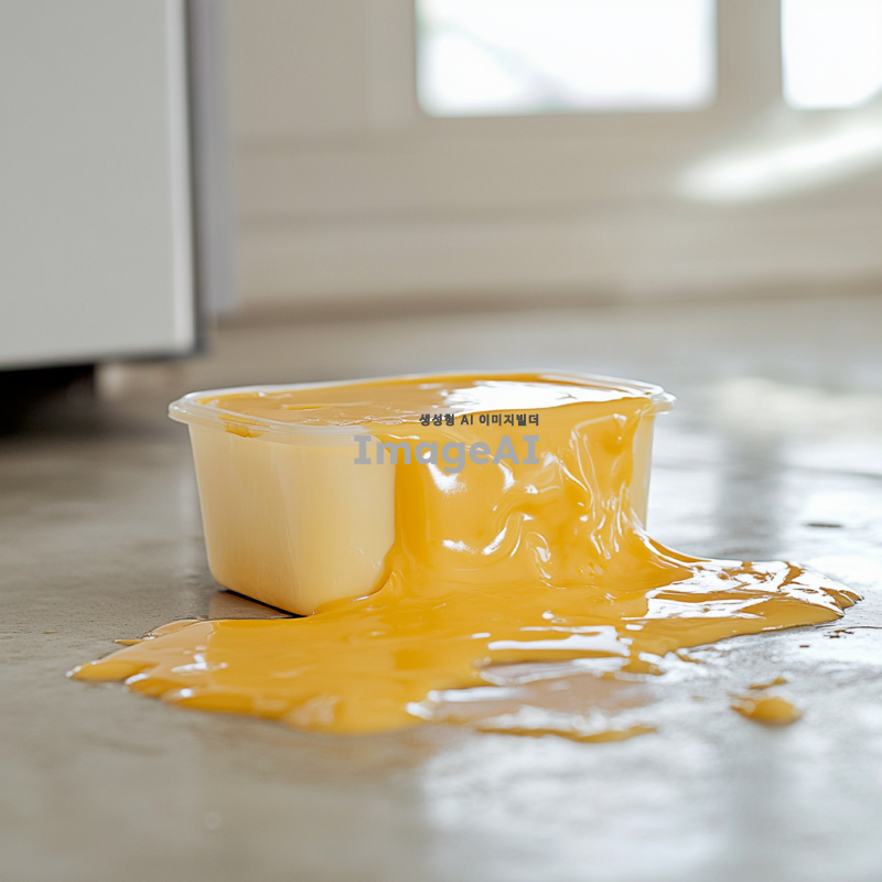 플라스틱 용기에 담겨져 있는 녹아 있는 치즈가 냉장고 안에서 꺼내다가 바닥으로 떨어져 플라스틱 용기는 뒤집어져 있고 걸쭉한 액체 형태의 치즈가 바닥에 엎질러져 있는 상황을 그려줘