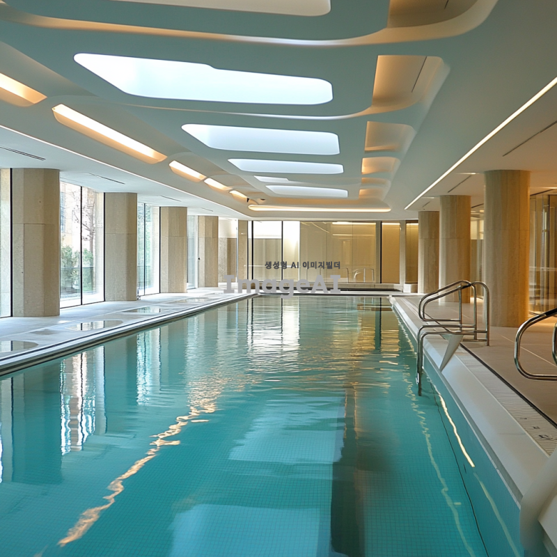 실내 수영 연습실, 현대적이고 깔끔한 디자인, 넓은 수영장과 푸른 물, 조명이 잘 배치된 쾌적한 환경, 벽면은 유리로 되어 있어 자연광이 잘 들어옴, 수영장 주변에는 안전을 위한 부드러운 난간과 미끄럼 방지 타일, 수영장 한쪽에는 초보자를 위한 얕은 구역, 전체적으로 조화로운 색상 배치와 세련된 인테리어.