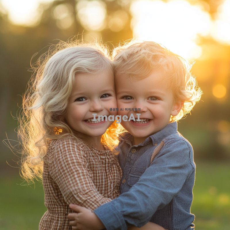 미국인 쌍둥이 아이들, 여자아이와 남자아이, 밝고 친근한 표정, 캐주얼한 옷차림, 자연스러운 배경, 따뜻한 햇살이 비치는 공원에서 놀고 있는 모습, 서로 웃으며 장난치는 장면, 금발 머리와 푸른 눈, 활기차고 즐거운 분위기.