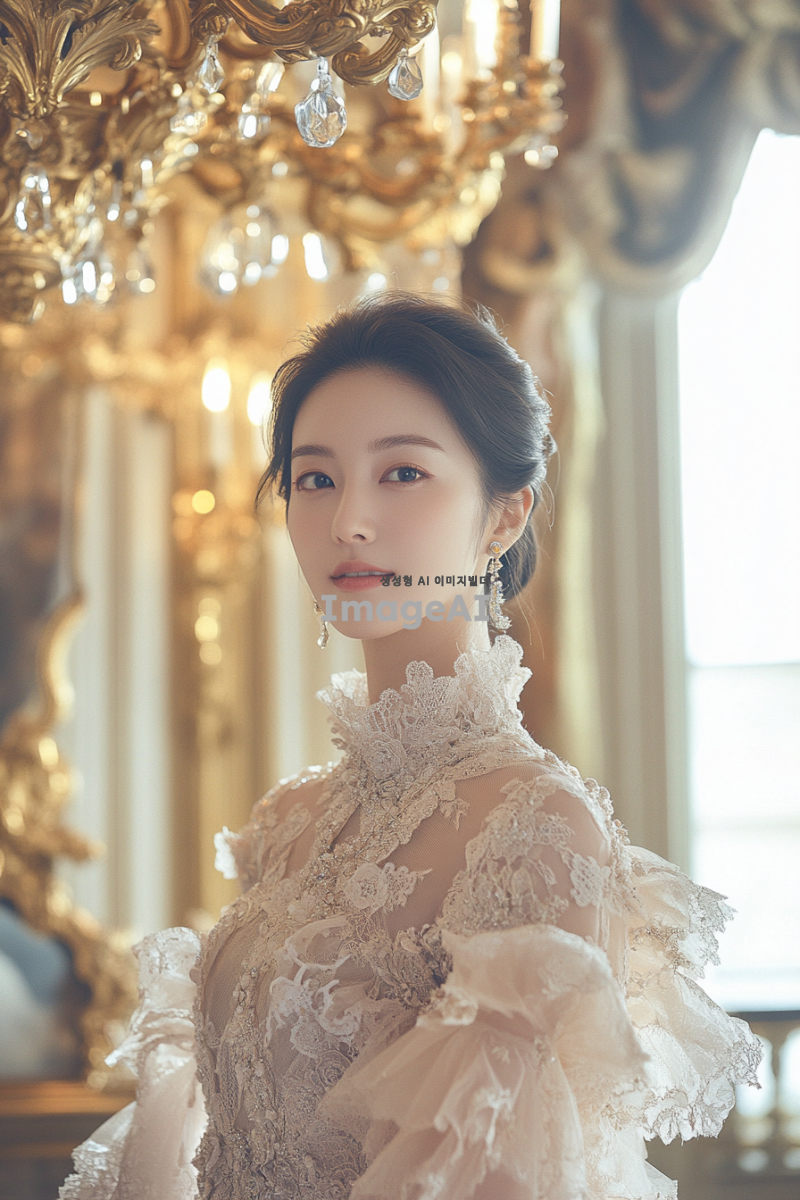 로코코 스타일의 화려한 드레스를 입은 한국인 여성, 드레스는 섬세한 레이스와 볼랑 장식이 가득하고, 부드러운 파스텔 톤의 색상으로 디자인됨. 배경은 18세기 유럽의 화려한 궁전 내부, 금빛 샹들리에와 고풍스러운 가구들이 조화를 이루며, 여성은 우아하게 미소 짓고 있음. 드레스의 디테일이 돋보이도록 조명은 부드럽고 따뜻한 느낌으로 설정.