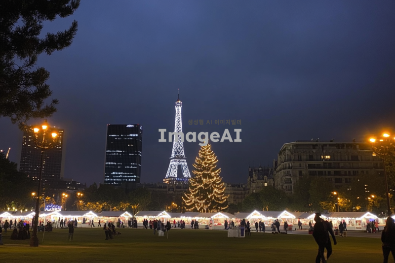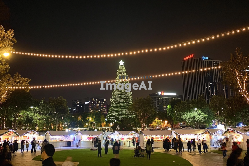 이 공원에 파리 크리스마스마켓 처럼 크리스마스 마켓행사가 진행중인것처럼 바꿔줘. 중앙엔 초대형 크리스마스 트리도 있고, 야외에는 화려한 알전구 조명들로 장식되어 있고, 하얀색으로 된 크리스마스 마켓 길거리 노점들도 빼곡하게 일렬로 들어서 있고, 축제를 즐기는 사람들로 발 디딜틈 없이 빼곡하게 가득차 있고.
