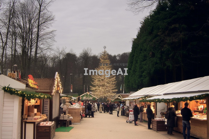 이 공원에 크리스마스 마켓행사가 진행중인것처럼 바꿔줘. 중앙엔 초대형 크리스마스 트리도 있고, 야외에는 화려한 알전구 조명들로 수놓아져 있고, 하얀색으로 된 크리스마스 마켓 길거리 노점들도 빼곡하게 일렬로 들어서 있고, 축제를 즐기는 사람들로 발 디딜틈 없이 빼곡하게 가득차 있고.