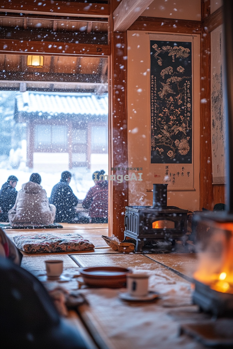 따뜻한 겨울철 분위기의 한국 전통 온돌방, 창밖에는 눈이 내리고 있고 방 안에는 아늑한 조명 아래에서 따뜻한 차를 즐기는 사람, 방 안에는 전통적인 한국식 난로와 두꺼운 담요가 놓여 있으며, 벽에는 한국 전통 문양이 장식된 그림이 걸려 있는 장면, 포근하고 편안한 느낌을 강조