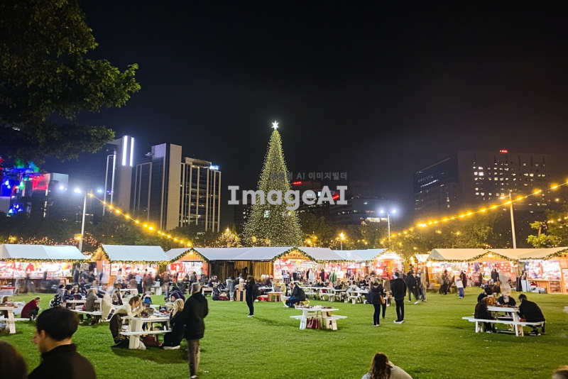 넓은 잔디 공원에 광범위 하게 크리스마스 마켓 초대형 행사가 진행중인것처럼 바꿔줘. 중앙엔 초대형 크리스마스 트리도 있고, 야외에는 화려한 알전구 조명들로 수놓아져 있고, 하얀색으로 된 크리스마스 마켓 길거리 노점들도 빼곡하게 일렬로 들어서 있고, 행사장 중앙엔 수천명의 사람들이 동시에 음식을 먹을 수 있는 테이블들이 있고, 축제를 즐기는 사람들로 발 디딜틈 없이 빼곡하게 가득차 있고.