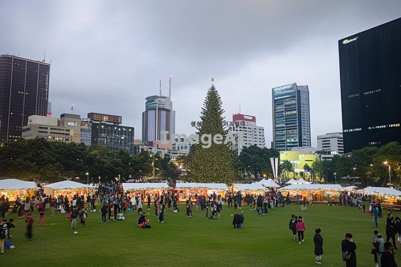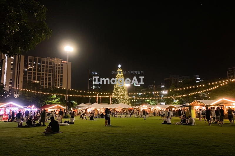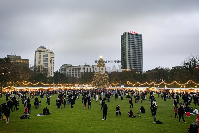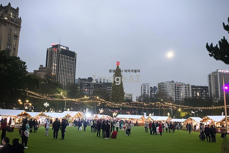 넓은 잔디 공원에 광범위 하게 10만명 정도 동시 수용가능한, 크리스마스 마켓 초대형 행사가 진행중인것처럼 바꿔줘. 중앙엔 초대형 크리스마스 트리도 있고, 야외에는 화려한 알전구 조명들로 수놓아져 있고, 하얀색으로 된 크리스마스 마켓 길거리 노점들도 빼곡하게 일렬로 들어서 있고, 축제를 즐기는 사람들로 발 디딜틈 없이 빼곡하게 가득차 있고.