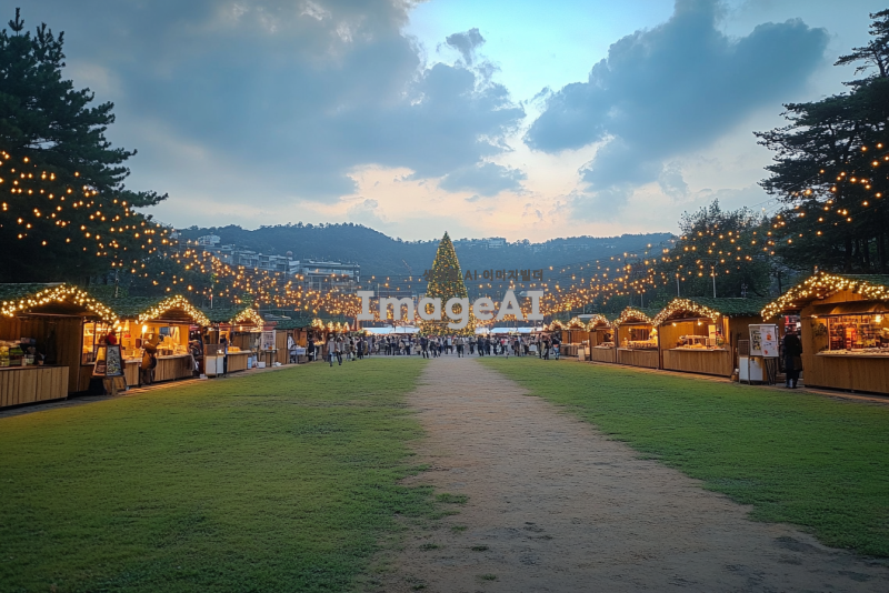 이 장소를 10만명 동시 참여 가능한 크리스마스 마켓 초대형 행사장으로 바꿔줘. 시간은 조명이 잘 보이는 한밤중으로. 행사장 가운데에는 초대형 크리스마스 트리가 있고, 행사장에는 하얀색으로 된 크리스마스 느낌 물씬나는 길거리 음식 노점들로 빼곡히 가득 차 있고, 알전구로 빼곡하고 화려하게 장식되어 있고, 축제를 즐기는 사람들로 발 디딜틈없이 빼곡히 가득차 있고.