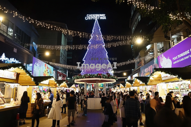 이 장소를 크리스마스 마켓 초대형 축제 행사장으로 바꿔줘. 행사장 가운데에는 초대형 크리스마스 트리가 있고, 행사장에는 하얀색으로 된 크리스마스 느낌 물씬나는 길거리 음식 노점들로 일렬로 쭉 늘어서 있고, 행사장은 알전구 조명들로 화려하게 장식되어 있고, 축제를 즐기는 사람들로 발 디딜틈없이 빼곡히 가득차 있고.