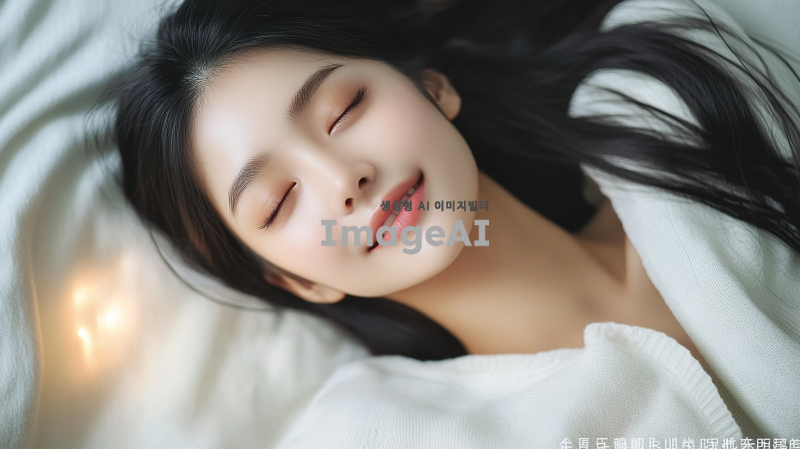 잠들기 전 부드러운 흰색 이불 위에 편안하게 누워있는 동양 여성, 그녀의 얼굴은 평화롭고 만족스러운 미소를 띠고 있으며, 긴 머리카락은 자연스럽게 흩어져 있다. 방 안은 따뜻한 색감의 조명으로 포근한 분위기를 자아낸다.