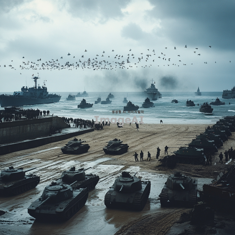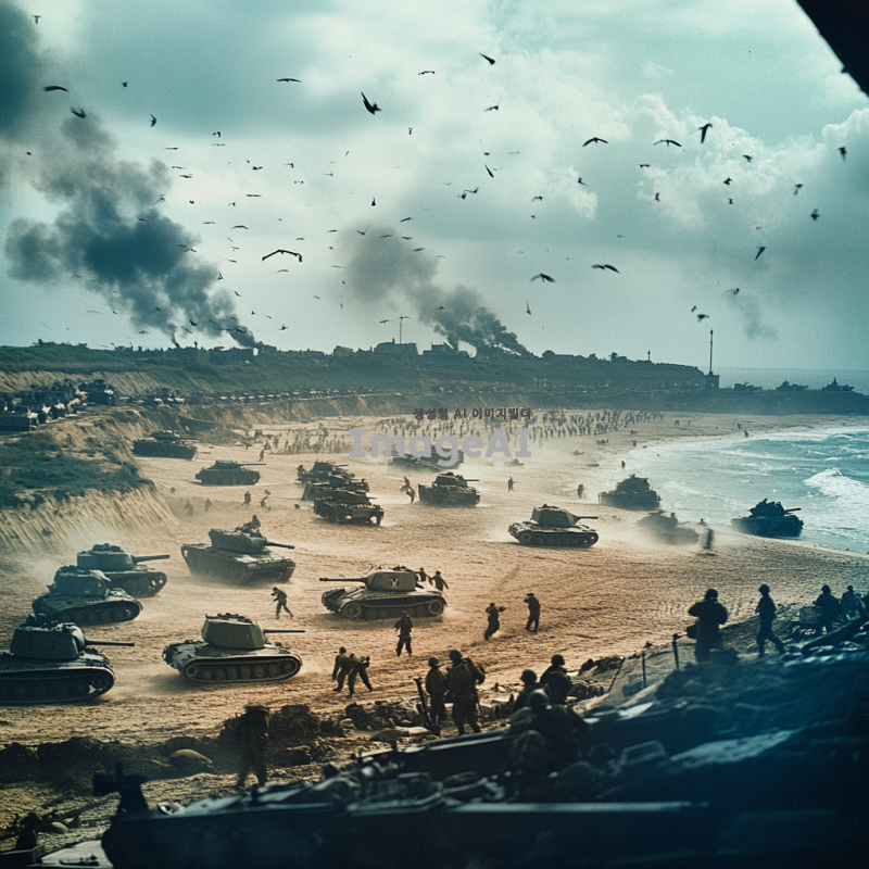 세계2차대전 노르망디상륙 작전 배경으로, 미군이 노르망디 만에 상률하는 장면, 독일군인 이를 저지하는 장면, 독일군 탱크 다수, 미군은 항공모함 다수