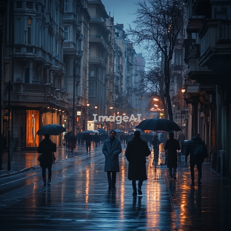 쓸쓸한 도시 배경, 흐린 날씨, 회색빛 건물들이 벽처럼 줄지어 서있는 거리, 가로등이 켜진 저녁 시간, 많은 사람들이 코트를 입고 우산을 들고 걸어가는 모습, 바쁜 일상 속 무표정한 얼굴, 도시의 소음이 느껴지는 배경, 조용히 걷는 사람들, 차가운 바람이 불어오는 거리, 도시의 쓸쓸한 분위기 강조, 아이레벨 샷 규도.