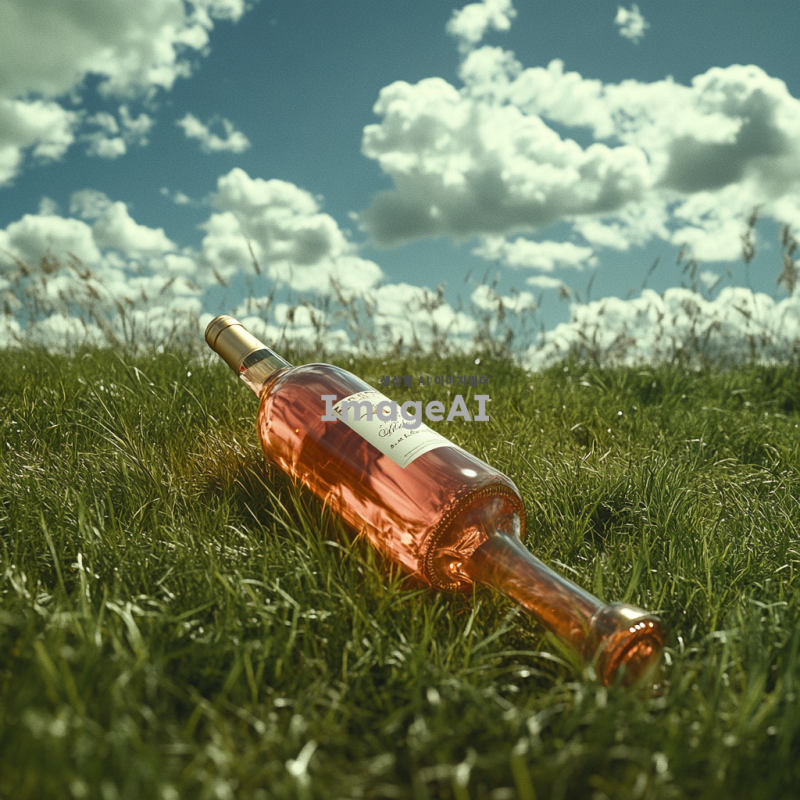 푸른 하늘 아래 초원 위를 달리는 다리 달린 박카스 병, 에너지 넘치는 역동적인 포즈, 병의 라벨이 선명하게 보이도록, 생동감 있는 움직임 강조, 바람에 흔들리는 풀과 함께 자연스러운 배경.
