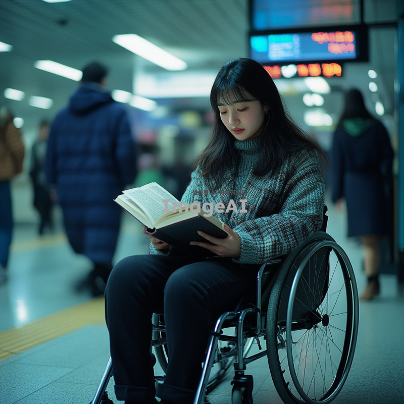 지하철 역 플랫폼에서 책을 읽고 있는 22세 한국인 여성, 휠체어에 앉아있으며 편안한 표정을 짓고 있음. 주변에는 바쁜 사람들로 가득 차 있지만, 그녀는 독서에 집중하고 있음. 그녀의 옷은 캐주얼하면서도 세련된 스타일이며, 책은 흥미로운 소설로 보임. 지하철 역의 배경은 현대적이고 깨끗한 느낌.