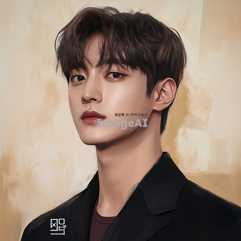 앞머리를 깐 짧은 검정 머리를 한 한국인 남성, 20대, 검은색 정장 차림, 세련된 분위기, 중간 거리에서의 초상화, 부드러운 조명, 현대적인 스타일, 무표정, 잘생김, 스케치