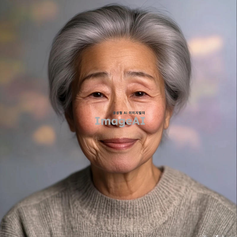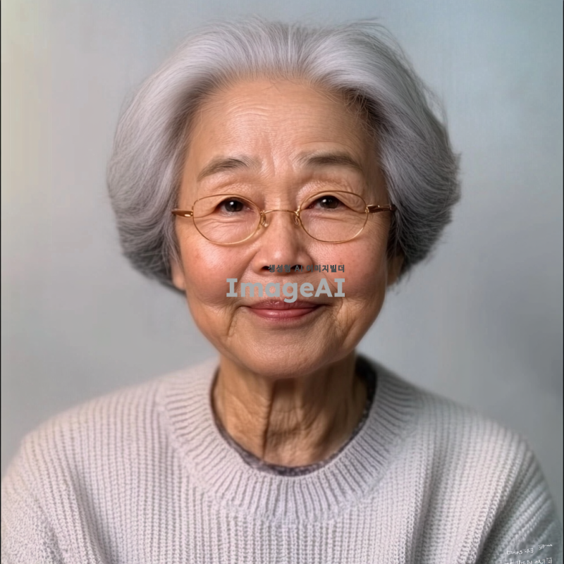 백발의 한국인 할머니, 증명사진 스타일, 눈가와 광대에 주름이 있으며 인자한 미소를 짓고 있음, 부드러운 조명, 중립적인 배경, 따뜻하고 친근한 분위기.