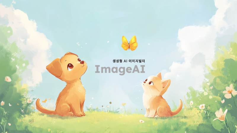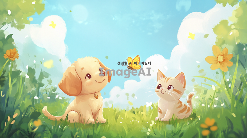 밝고 사랑스러운 분위기의 일러스트, 푸른 하늘 아래 푸른 들판에서 귀여운 강아지와 고양이가 나란히 앉아 있는 모습, 강아지는 작은 노란색 나비를 쫓고 있고, 고양이는 작은 꽃을 바라보고 있는 장면, 전체적으로 따뜻하고 포근한 색감, 부드러운 그림체, 한국적인 느낌을 살린 전통 문양이 살짝 가미된 배경.