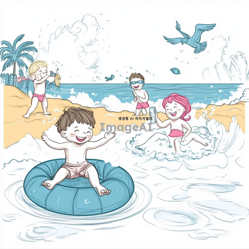 물놀이하는 어린이들의 장면, 해변가에서 튜브를 타고 있는 아이들, 물총으로 서로 물을 뿌리는 모습, 웃고 있는 얼굴들, 간단한 선으로 표현된 바다와 모래, 밝고 명랑한 분위기, 색칠하기 쉽게 선명한 외곽선, 복잡하지 않은 배경.