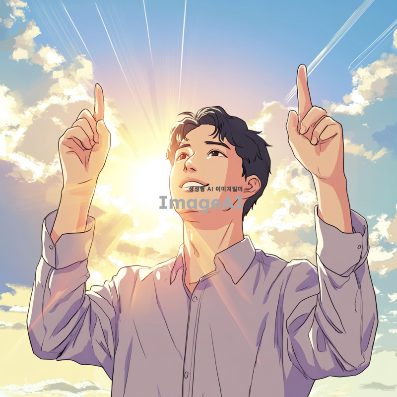 하늘을 배경으로 검지손가락 두 개를 위로 찌르는 동작을 하는 한국인, 밝고 활기찬 분위기, 손가락 끝에서 빛이 나는 효과, 맑은 하늘과 구름이 있는 배경, 캐주얼한 옷차림, 자연스러운 포즈와 표정, 일러스트 스타일