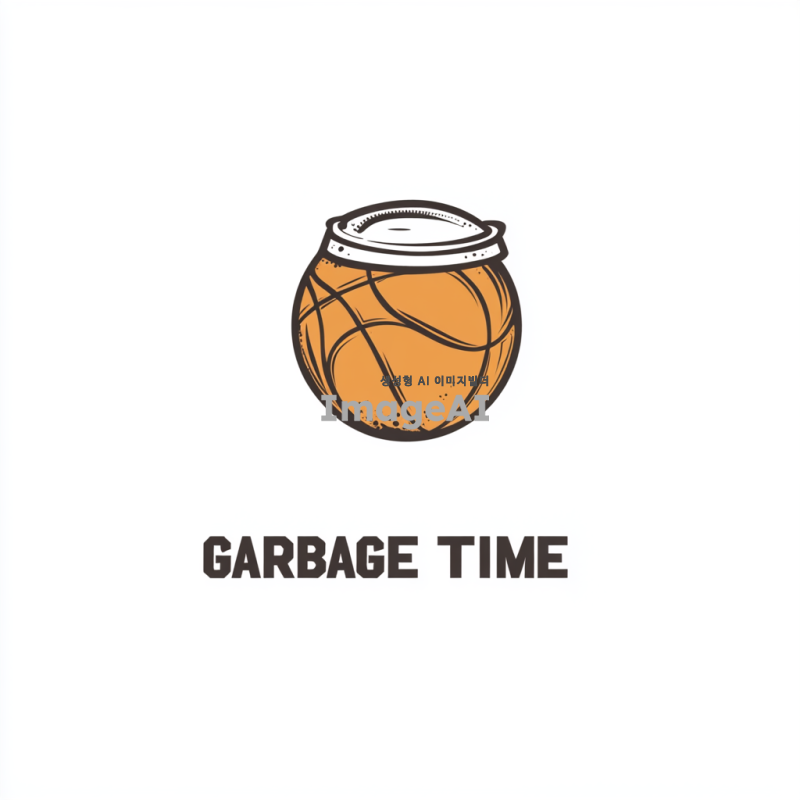 농구공과 휴지통 뚜껑을 결합한 창의적인 아이콘 디자인. 농구공은 중앙에 위치하며, 그 위에 휴지통 뚜껑이 농구 골대처럼 올려져 있는 모습. 아이콘 아래에는 "GARBAGE TIME"이라는 팀 이름이 간결하고 현대적인 서체로 적혀 있음. 배경은 심플한 흰색으로 두어 아이콘과 텍스트가 돋보이도록 구성.