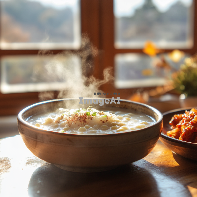 따뜻한 아침 햇살이 비치는 전통 한국 주방, 나무로 된 테이블 위에 신선한 콩 비지가 담긴 그릇, 옆에는 김치와 밥이 놓여 있으며, 정성스럽게 준비된 한국 가정식의 따뜻한 분위기, 그릇에서 김이 모락모락 피어오르는 모습, 자연스러운 색감과 조화로운 배치.