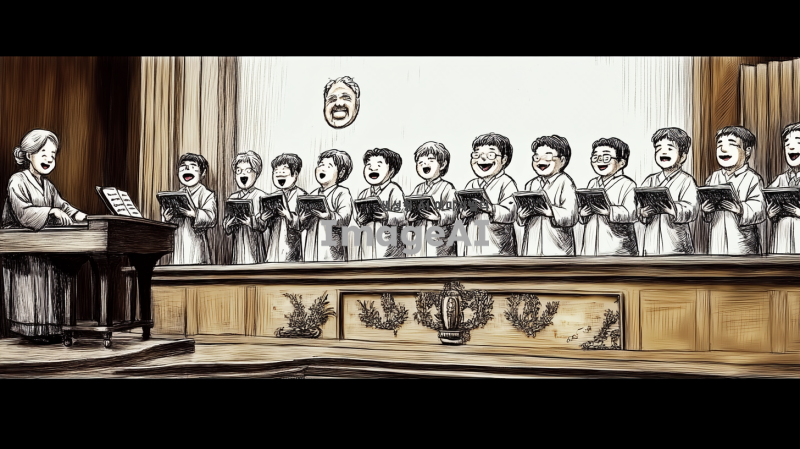 무대 위에서 노래하는 10명의 40대 한국인 남성 합창단을 캐리커처 스타일로 그린다. 각 인물의 얼굴과 체형, 헤어스타일, 복장은 첨부된 이미지의 인물들과 유사하게 유머러스하게 표현한다. 합창단의 제일 왼쪽에는 피아노를 치고 있는 여자 반주자가 있으며, 그녀는 집중하며 피아노를 연주하는 모습이다. 피아노 반주자의 얼굴과 체형, 헤어스타일, 복장도 첨부된 이미지와 최대한 비슷하게 표현한다. 무대는 클래식한 분위기의 교회 내부 단상으로 구성되어 있으며, 부드러운 조명이 비추고 있다. 전체적인 구도와 인물 구성은 첨부된 이미지와 유사하게 반영한다.