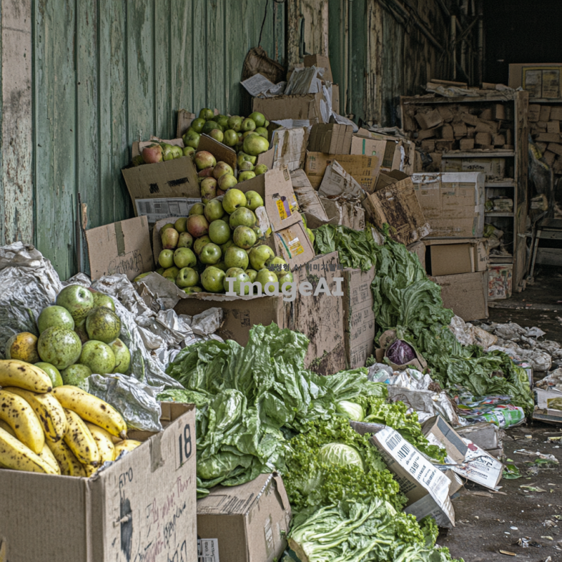 식료품 창고에서 상한 채소와 과일이 진열된 모습, 흐릿한 조명 아래에서 신선하지 않은 사과, 바나나, 상추 등이 놓여 있는 장면, 약간의 곰팡이가 피어 있는 모습과 함께 주변에 지저분한 종이 박스와 신문지가 깔려 있는 장면, 배경은 관리가 잘되어있지 않는 창고의 느낌이 나도록 연출.