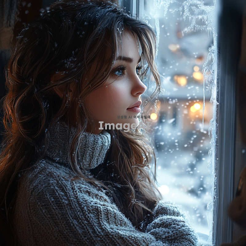 겨울 창밖을 바라보는 소녀, 눈이 내리는 풍경, 창문에 서리가 가득, 소녀의 표정은 깊은 생각에 잠겨 있으며 약간의 슬픔이 느껴짐, 따뜻한 니트 스웨터를 입고 있음, 창문 너머로 보이는 겨울 풍경은 쓸쓸하면서도 아름다움, 방 안은 아늑하고 조용한 분위기, 자연광이 부드럽게 들어오는 장면, 소녀의 긴 머리가 어깨에 흘러내림, 창문에 비친 소녀의 희미한 반영
