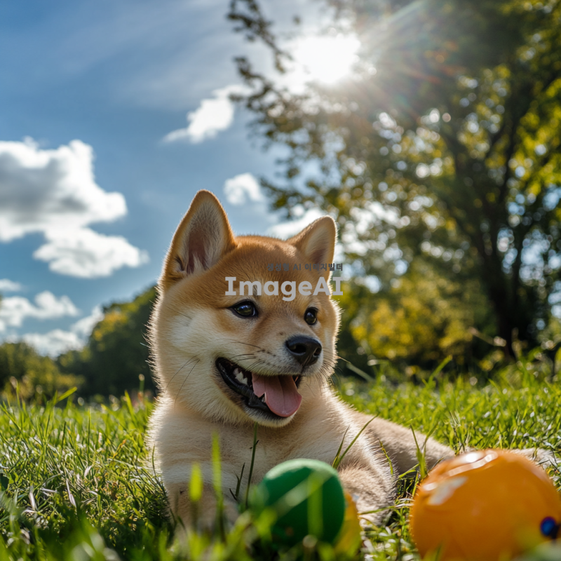 밝은 햇살 아래 공원에서 장난감과 함께 놀고 있는 귀여운 시바견, 부드럽고 윤기 나는 털, 활기찬 표정, 주변에는 푸른 잔디와 나무들, 배경에는 맑은 하늘과 흰 구름.