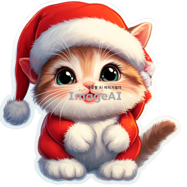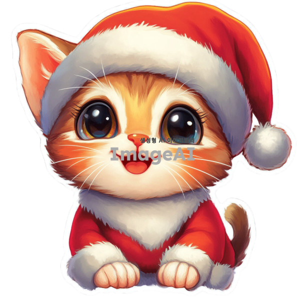 700x700 픽셀 크기의 배경 없는 사랑스럽고 매우 귀여운 실제 아기 고양이 산타 스티커 이미지, 산타 모자를 쓰고 있는 고양이, 부드러운 털과 큰 눈, 귀엽고 장난기 있는 포즈, 밝고 따뜻한 색감, 고양이의 털과 산타 모자의 질감이 잘 드러나도록.