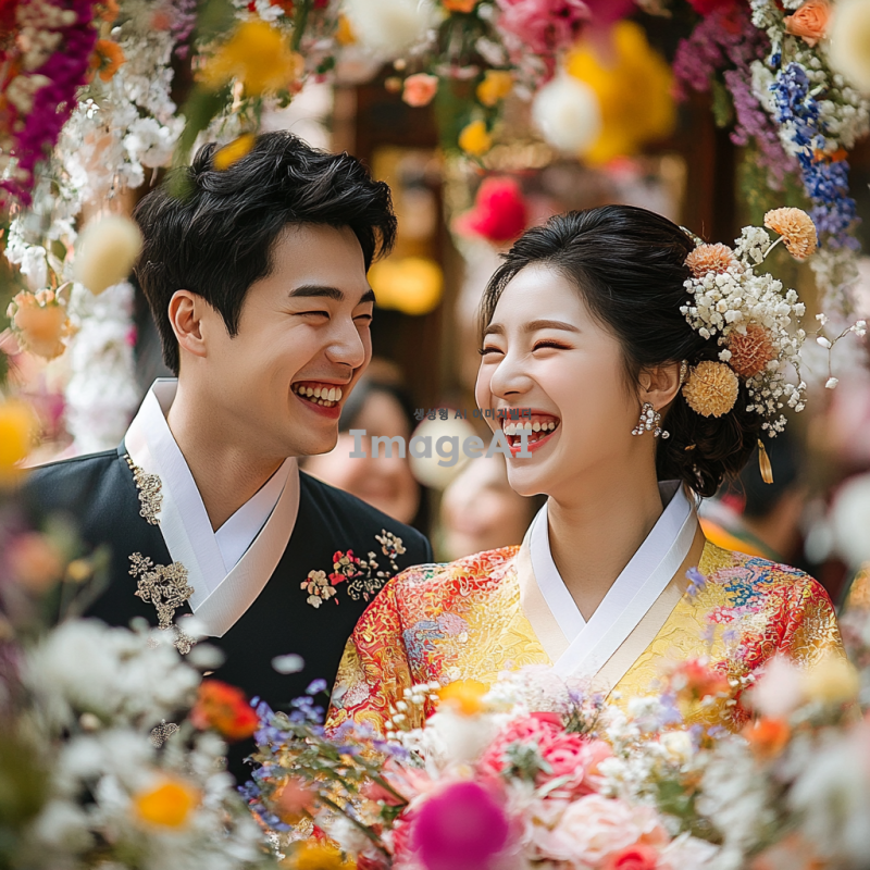 따뜻하고 행복한 분위기의 결혼식 장면, 신랑과 신부가 전통 한복을 입고 환하게 웃고 있는 모습, 주변에는 화려한 꽃 장식과 가족들이 축하하는 장면, 한국 전통 결혼식의 아름다움을 강조, 밝고 환한 색감, 사랑과 기쁨이 가득한 느낌