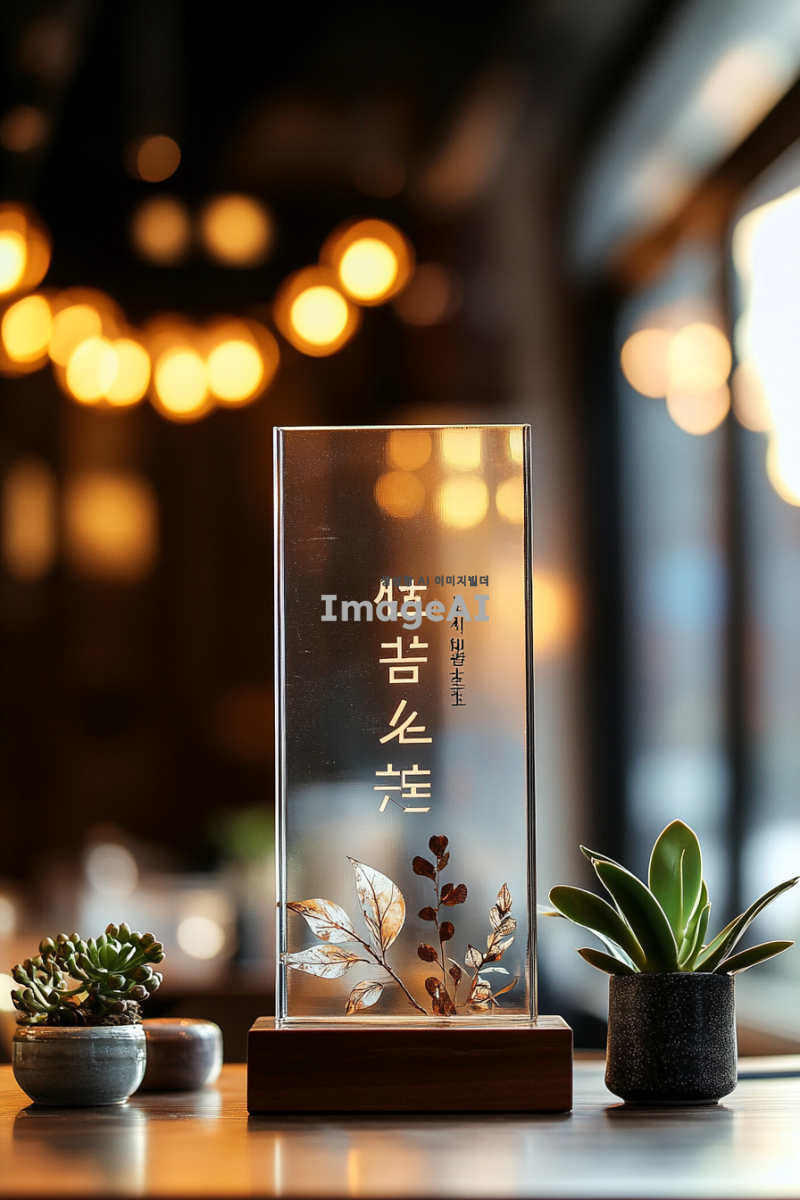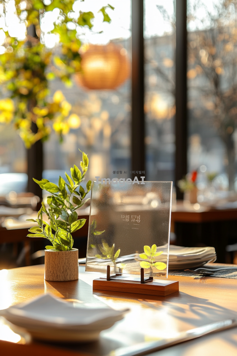아크릴 미니 입간판 디자인, 테이블 위에 놓인 모습, 현대적이고 세련된 스타일, 반짝이는 아크릴 재질, 깔끔한 타이포그래피, 밝고 생동감 있는 색상, 식당이나 카페의 분위기를 강조하는 요소, 주변에 작은 식물 장식, 따뜻한 조명 아래의 분위기, 한국적 미적 요소 포함.