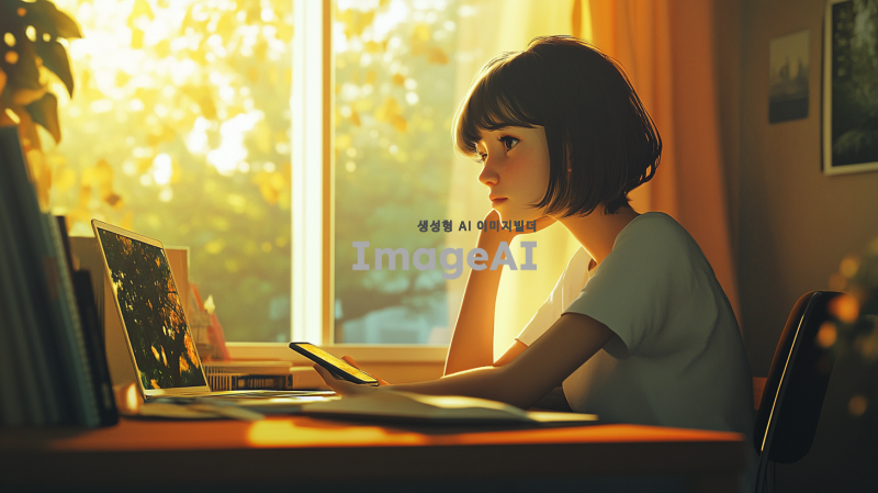 단발머리를 한 여학생이 피곤한 얼굴로 책상에 앉아 스마트폰을 내려놓고 있다. 창 밖으로는 아침 햇살이 밝게 비추며, 그녀는 창 밖을 바라보고 있다. 방 안에는 따뜻한 색감의 아침 햇살이 스며들어 있으며, 책상 위에는 노트북과 책들이 어지럽게 놓여 있다. 여학생의 눈에는 살짝 피곤함이 묻어나지만, 창 밖을 바라보는 모습은 평화롭다. 4K 해상도로 생생하게 표현된 아침의 분위기와 여학생의 섬세한 표정이 돋보인다.