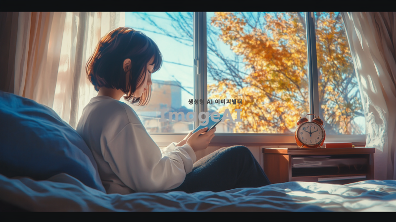 아침 햇살이 창문을 통해 부드럽게 들어오는 방 안, 단발머리를 한 여학생이 침대에 앉아 스마트폰을 들여다보는 모습. 여학생은 파자마를 입고 있으며, 침대 옆에는 작은 탁자와 알람시계가 놓여 있다. 방 안은 아늑하고 따뜻한 느낌으로 꾸며져 있으며, 창밖으로는 맑은 하늘과 나무가 보인다. 4K 해상도의 생생한 디테일로 표현된 장면.