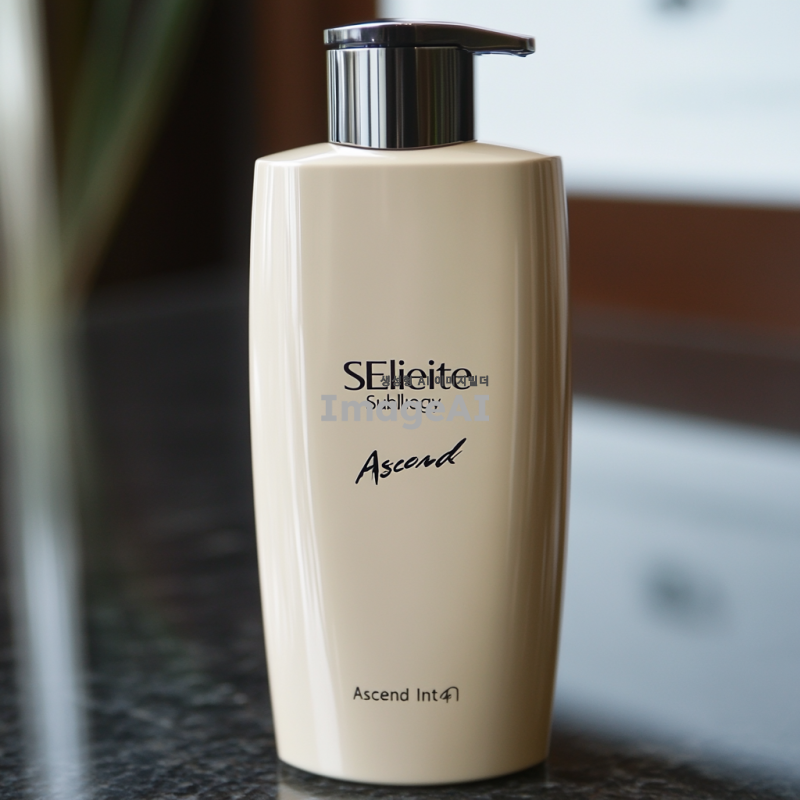 1️⃣ 고급스러운 시세이도 "SElite Sublogy Ascend Intظ" 샴푸는 우아하고 키가 크며 날씬한 병 디자인을 특징으로 하며, 매끄러운 표면이 빛을 아름답게 반사합니다. 샴푸의 전면 라벨은 베이지 색상이며 일본어 문자로 굵게 텍스트가 작성되어 있습니다. 'Sublimic visage aqua intense leave shamic hair'라고 적혀 있습니다. 라벨의 오른쪽 상단 모서리에는 흰색 배경에 미국 뷰티 로고가 작게 있습니다.