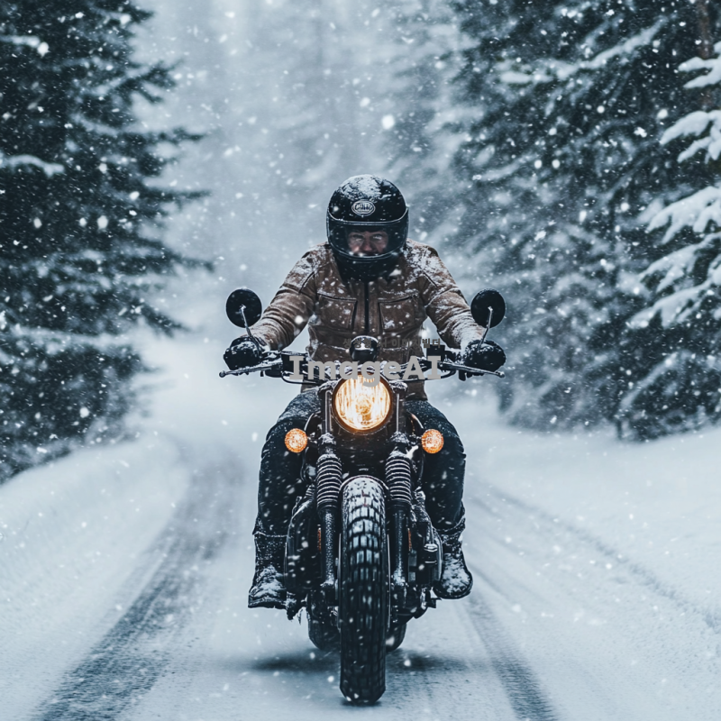겨울철 눈이 내리는 배경에 오토바이를 타고 있는 사람, 두꺼운 방한복을 입고 헬멧을 쓴 모습, 차가운 바람을 맞으며 눈길을 달리는 상황, 주변에는 눈 덮인 나무와 길이 있으며, 하늘에서 눈송이가 흩날리는 장면, 사람의 표정은 추워보이지만 즐거운 느낌을 주는 모습.