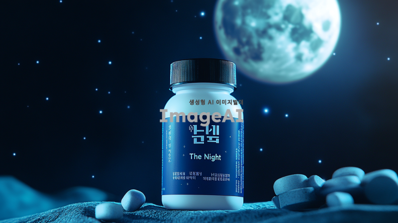 1️⃣ 수면 보조제의 검정색과 파란색 라벨이 있는 흰색 플라스틱 병, 제품 사진, 스티커에 "The Night"라는 한글 텍스트가 있는 정면 뷰, 달빛 배경, 광고 포스터, 한국 디자인 스타일, 각 정제가 twoumpotmilianpiredta 분말을 포함한 360g 병 크기