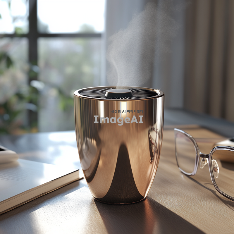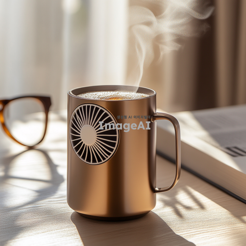 현대적인 디자인의 컵, 컵 가장자리에 작은 선풍기가 부착되어 있는 모습, 선풍기는 조용하게 작동하며 컵 안의 뜨거운 음료를 식히는 역할을 함, 컵은 세련된 금속 재질로 만들어져 있으며 반짝이는 표면, 음료는 김이 모락모락 나는 따뜻한 커피, 배경은 아늑한 실내 공간, 자연광이 부드럽게 들어오는 창문, 편안한 분위기의 인테리어, 컵 옆에는 책과 안경이 놓여 있는 장면.