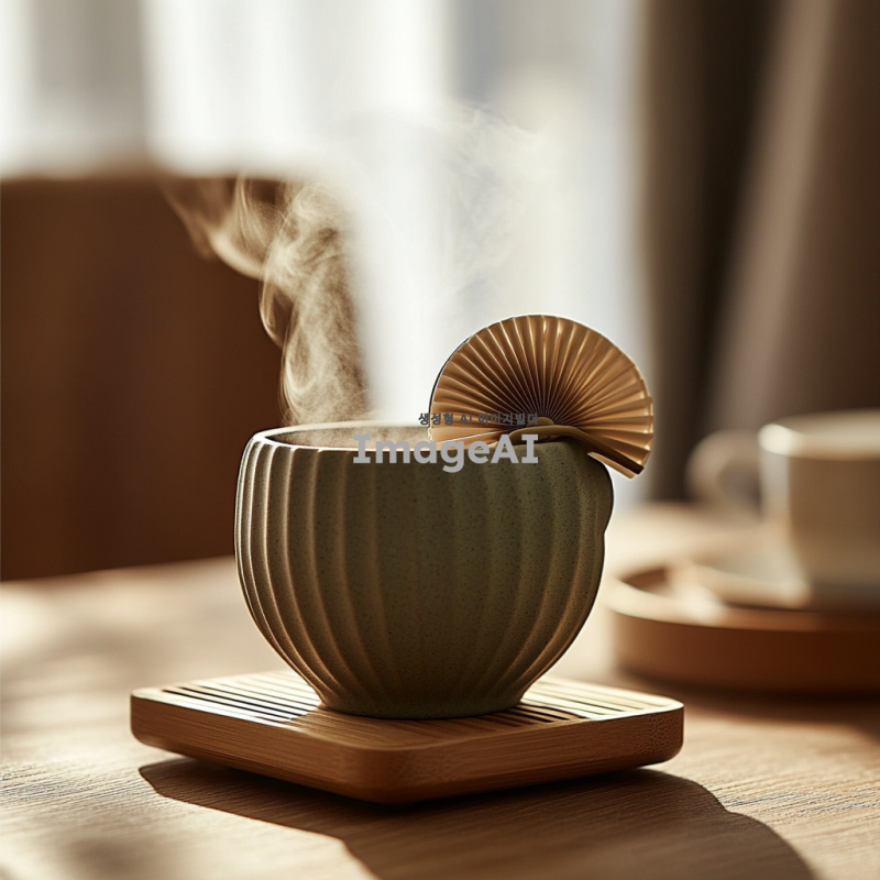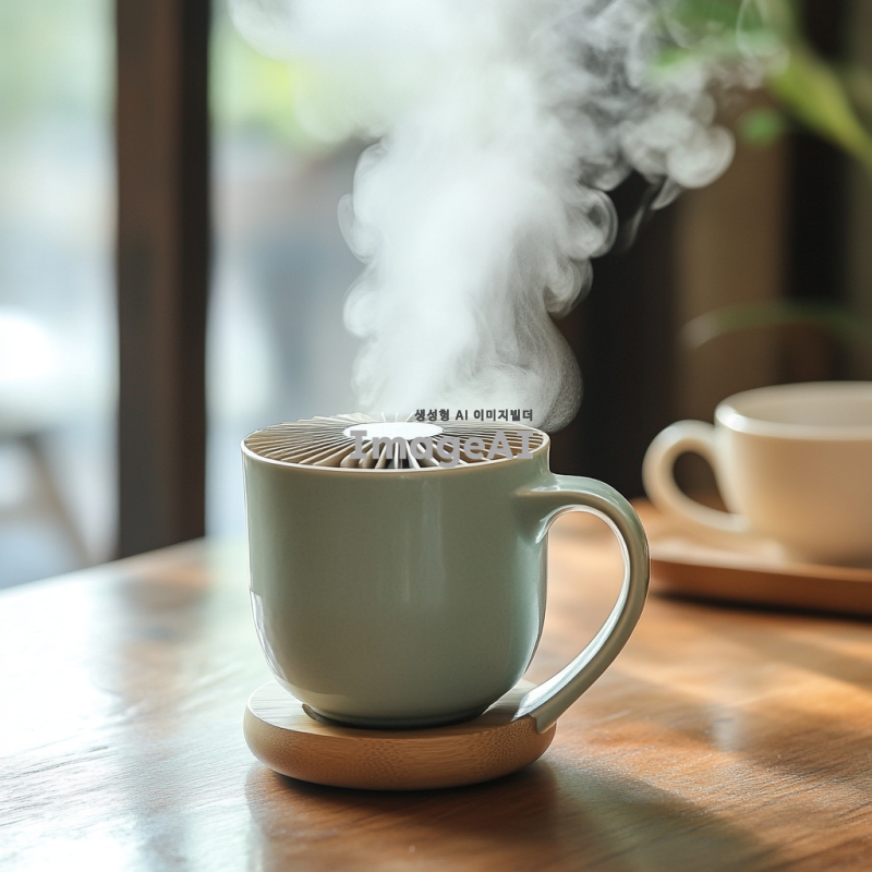 한국 전통 도자기 스타일의 컵, 손잡이에 작은 선풍기가 달려 있어 뜨거운 음료를 식혀주는 모습, 컵에는 따뜻한 김이 모락모락 피어오르고, 선풍기는 부드럽게 회전하며 바람을 일으키는 장면, 주변은 아늑한 카페 분위기, 나무 테이블 위에 놓인 컵, 자연광이 부드럽게 비치는 환경, 현대적이면서도 전통적인 디자인의 조화.