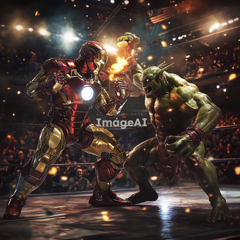 UFC 링 위에서 싸우는 장면, 아이언맨은 그의 고유한 금속 수트와 빨간색과 금색의 디자인을 입고 있으며, 고블린은 초록색 피부와 날카로운 이빨을 가진 모습으로 표현. 아이언맨은 그의 손에서 에너지를 발사하는 기술을 사용하고 있으며, 고블린은 민첩하게 회피하면서 반격을 준비하고 있는 동작. 링 주변에는 관중들이 열광적으로 응원하고 있으며, 조명이 강하게 비추고 있는 역동적인 경기 분위기. 현실적이고 세밀한 묘사로, 두 캐릭터의 동작이 생생하게 표현된 이미지.클래시로얄에 등장하는 고블린의 이미지와 비슷하게