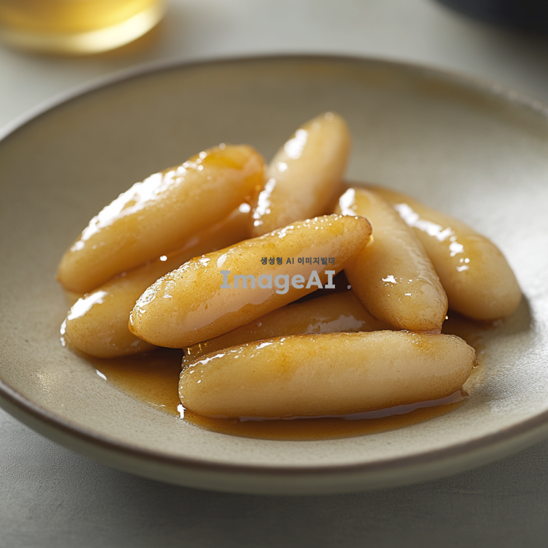한국 전통 가래떡이 황금빛 허니버터 소스로 윤기 있게 코팅되어 있는 모습. 가래떡은 길고 매끄러운 형태로, 달콤한 버터의 향기가 느껴질 듯한 비주얼. 허니버터 소스는 반짝이는 꿀과 부드러운 버터가 조화롭게 어우러져 있으며, 가래떡 위에 고루 퍼져 있는 모습..