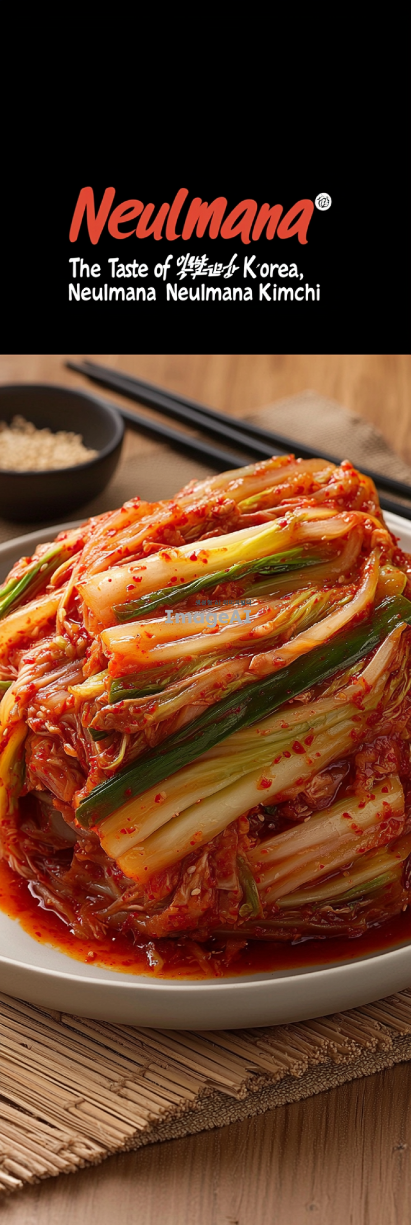 한국 전통 포기김치를 강조하는 광고 이미지. 신선하고 선명한 색상의 김치가 접시에 담겨 있으며, 배경은 따뜻하고 가정적인 분위기를 연출. 김치의 풍부한 양념과 식감이 잘 드러나도록 클로즈업. 이미지 상단에 "늘만나김치"라는 타이틀이 한국 전통 서체로 삽입되어 있으며, 타이틀은 붉은색과 녹색을 사용해 김치의 색감을 반영. 타이틀 아래에는 "한국의 맛, 늘만나김치"라는 문구가 작은 글씨로 추가되어 있음.