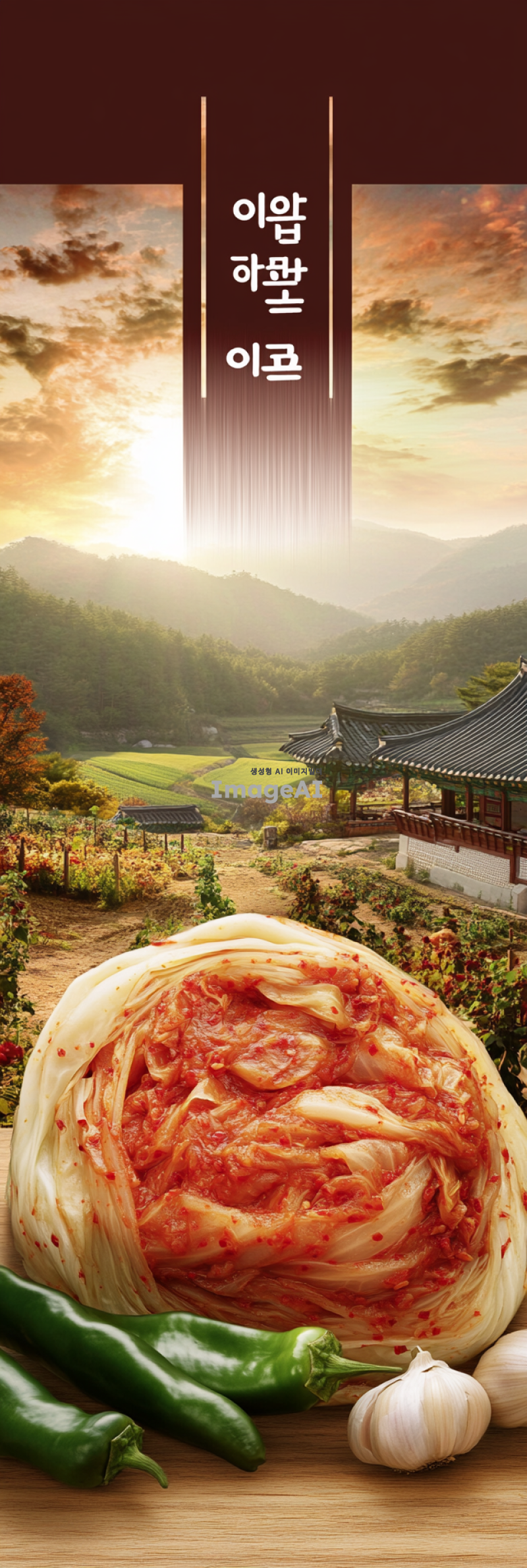 한국의 전통적인 농촌 풍경을 배경으로, 농업회사법인 늘만나식품(주)의 로고가 잘 보이게 배치된 포기김치가 중심에 놓인 이미지. 신선하고 맛있어 보이는 김치가 강조되며, 주변에는 잘 익은 배추와 고추, 마늘 등의 김치 재료들이 자연스럽게 배치되어 있어야 한다. 따뜻하고 친근한 느낌을 주는 색감으로, 전통과 현대가 조화를 이루는 분위기를 연출.